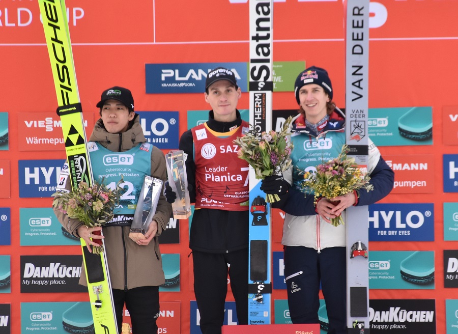 Z dvema odličnima poletoma, dolgima 232.5 in 230.5 metrov je Domen Prevc zanesljivo dobil petkovo tekmo v Planici, zbral je 471,4 točk. Drugi je bil Japonec Ren Nikaido z 232 in 233 metri ter 451,3 točkami, tretji pa Avstrijec Daniel Tschofenig z 221.5 in 233.5 metri ter 443,5 točkami.